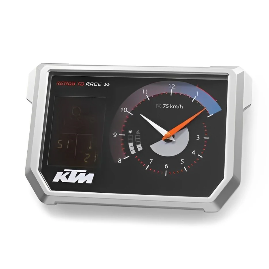این ساعت دیواری KTM عملاً شبیه صفحه کیلومتر موتور طراحی شده، نه یک ساعت معمولی. بر اساس چیزی که در عکس دیده میشود، ویژگیهاش را دقیق و کاربردی میگویم:
