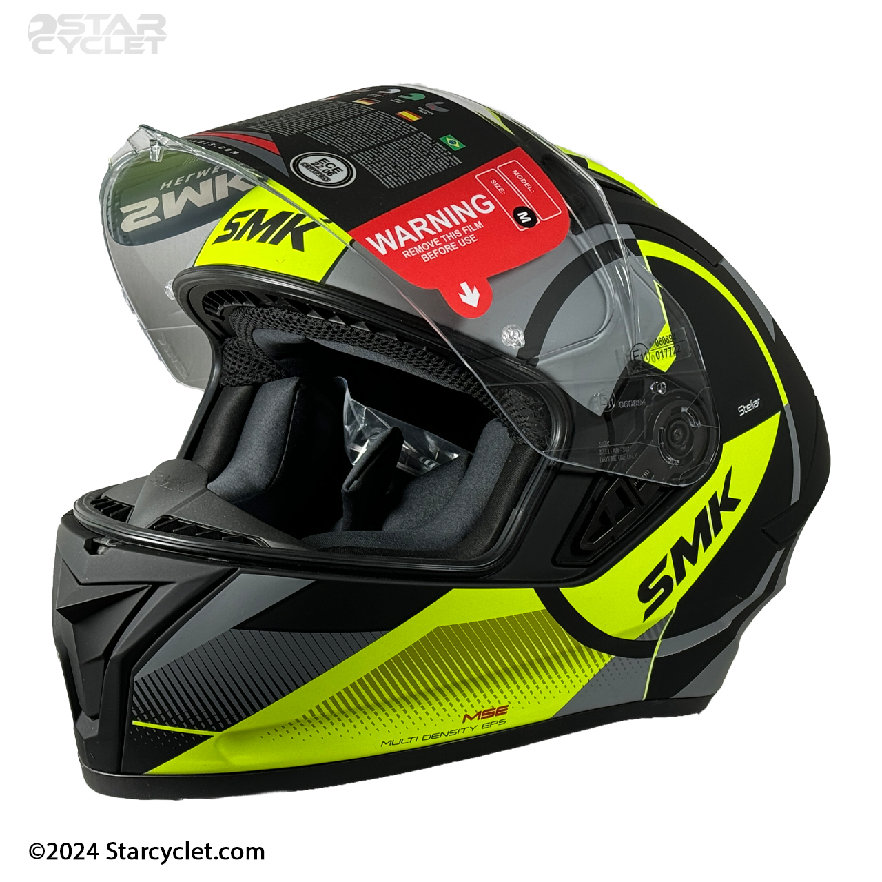 سری STELLAR یک کلاه فک ثابت از برند SMK هست که ضخامت فوم آن به 5 سانتی متر میرسه که نسبت به رقبای چینی که از پوسته 2 الی 3 سانتی‌متری استفاده می‌کنند ضربه‌پذیری بسیار بالاتری را ارائه می‌کند. البته این موضوع باعث حجیم‌تر شدن نسبی کلاه و تا حدودی کمی وزن بالاتر نسبت به رقبای خود پیدا کرده هرچند که وزن کلاه از استانداردهای جهانی خارج نشده است. برند های معتبر کلاه کاسکت در دنیا معمولا برای ارائه سایز بندی از 2 یا 3 شل استفاده می‌کنند در مدل STELLAR سایز L و XL دارای یک شل اختصاصی وسایز XXL یک شل دیگر دارد این در حالیست که کلاه‌های چینی همگی از یک شل استفاده می‌کنند و برای ارائه سایز بندی فقط ابرهای داخل کلاه را کوچک و بزرگ می‌کنند تا هزینه های تولید به حداقل برسانند و با توجه به اینکه پدهای داخلی کلاه چینی بعد از مدتی استفاده آزادتر میشوند و عملا درون کاسه سر بازی میکنند این موضوع خود نه تنها یک خطر جدی برای راکب است بلکه باعث ورود هوا و گرد و غبار به درون کلاه شما می‌شود.طرح‌های SMK استلار نیز بسیار متنوع و همه پسند است و برای یک موتورباز استفاده از آن بسیار جذاب خواهد بود.
