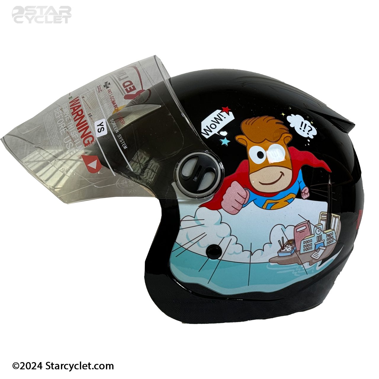 کلاه 908-BLACK از مواد باکیفیت و مقاوم ساخته شده که ایمنی کودکان را در برابر ضربات و آسیبهای ناگهانی تضمین میکند. این کلاه دارای طراحی جالبی است که بهویژه برای کودکان جذاب است؛ تصویری از یک سوپر قهرمان که به سرعت در حال پرواز است، باعث میشود که کودکان حین استفاده از کلاه احساس راحتی و لذت کنند. شیلد این کلاه از جنس مقاوم و ضدخش است که علاوه بر محافظت از چشمها در برابر باد و گرد و غبار، دید واضح و شفاف را فراهم میآورد.