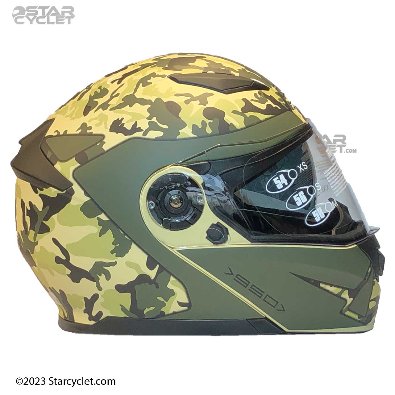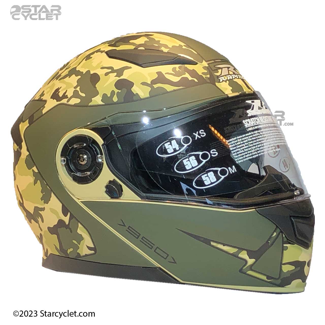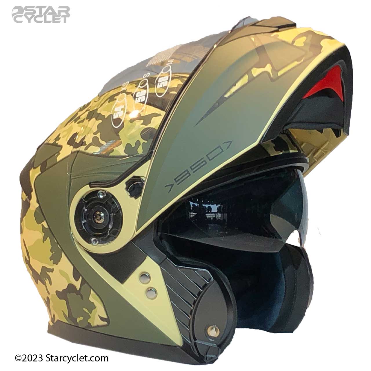 مدل 950 ARMY با ترکیب رنگهای سبز زیتونی و طرحهای استتاری، ظاهری نظامی و مقاوم ارائه میدهد. این طراحی برای موتورسوارانی که به دنبال هماهنگی با استایل موتورهای آفرود، نظامی یا اسپرت هستند، بسیار جذاب است. فک متحرک این کلاه به موتورسوار اجازه میدهد که به راحتی از حالت تمامصورت به نیمهباز تغییر وضعیت دهد، که این ویژگی بهویژه در مسیرهای طولانی و گرم بسیار کاربردی است.