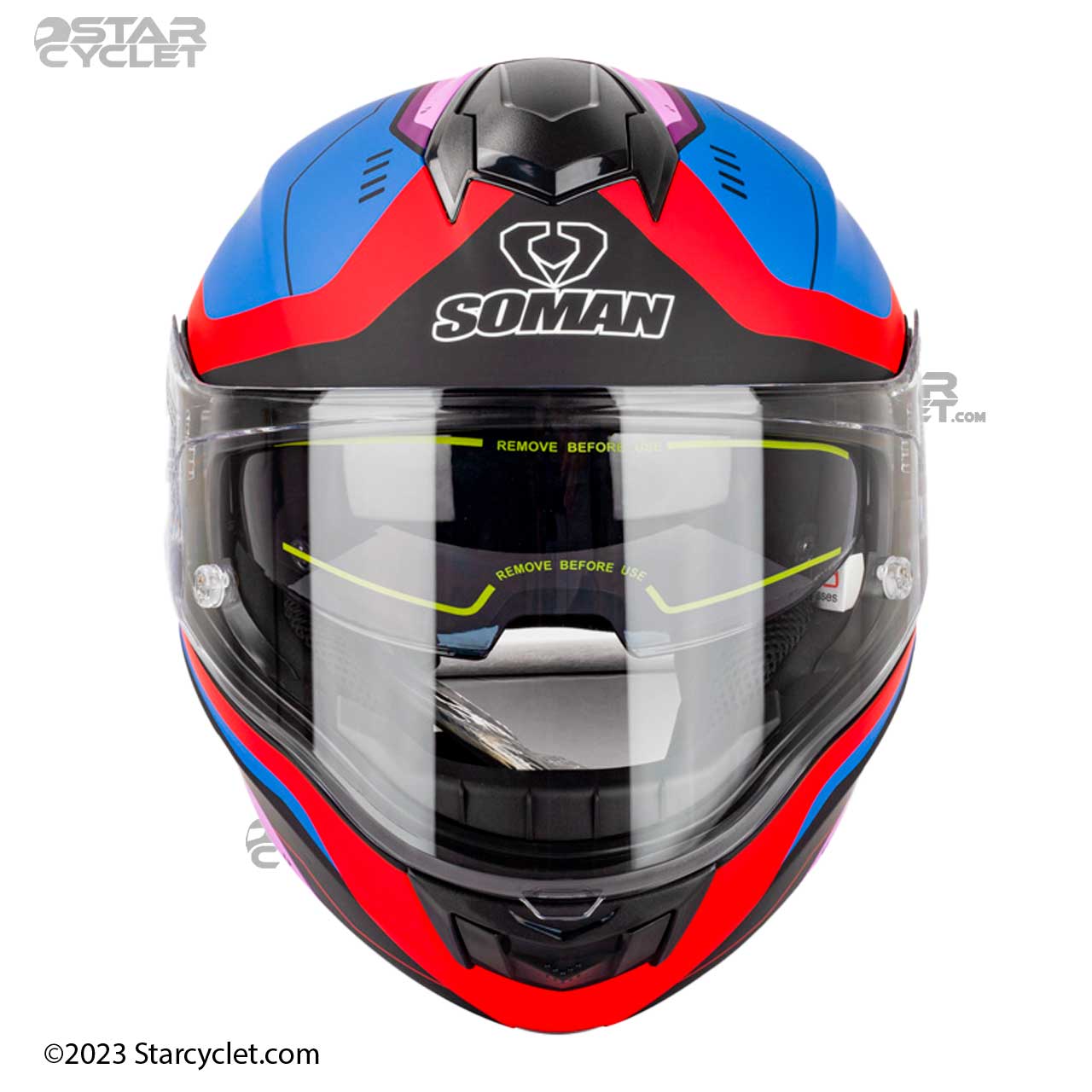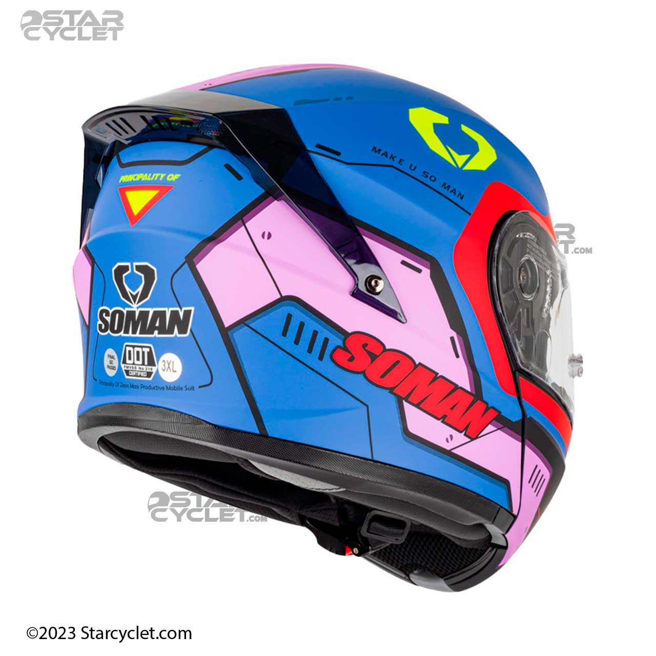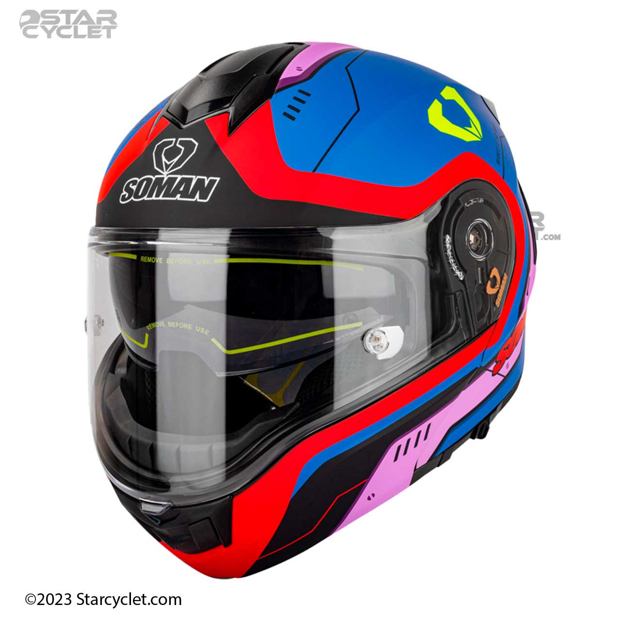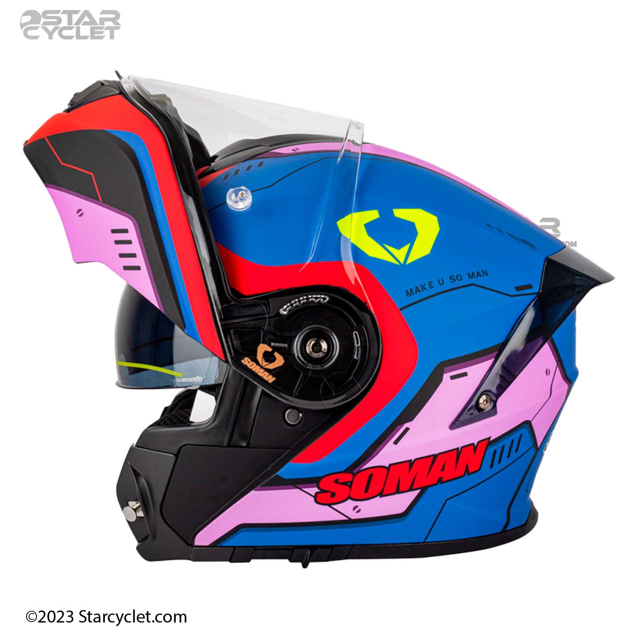 کلاه SOMAN 965 DOM با طراحی مدرن، رنگهای خاص آبی، قرمز و بنفش و گرافیکهای برجسته، یک انتخاب جذاب و جسورانه محسوب میشود. فک متحرک آن امکان تغییر بین حالت تمامفک و نیمهفک را فراهم میکند که انعطافپذیری بالایی را برای موتورسواران ایجاد کرده است. این مدل به دلیل طراحی خاص و رنگبندی جذاب، گزینهای عالی برای موتورسوارانی است که به دنبال یک کلاه خاص و متمایز هستند.