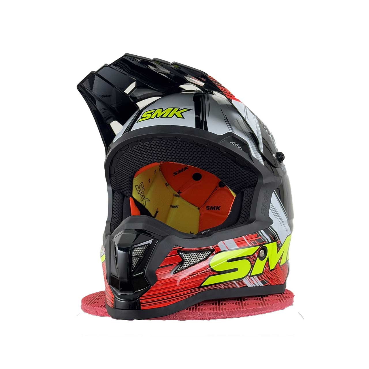 کلاه SMK Ultra Smiley بهوضوح یک مدل مخصوص آفرود است که طراحی آن بر اساس نیازهای مسابقات موتوکراس و اندورو انجام شده است. ساختار آیرودینامیک، برآمدگی جلوی کلاه، دریچههای تهویه متعدد و نقاب متحرک از ویژگیهایی هستند که آن را به یک گزینه حرفهای برای رانندگان آفرود تبدیل کردهاند. طراحی گرافیکی خاص آن، شامل ترکیبی از رنگهای قرمز، مشکی، زرد و نقرهای است که حس سرعت و انرژی را به موتورسوار القا میکند.