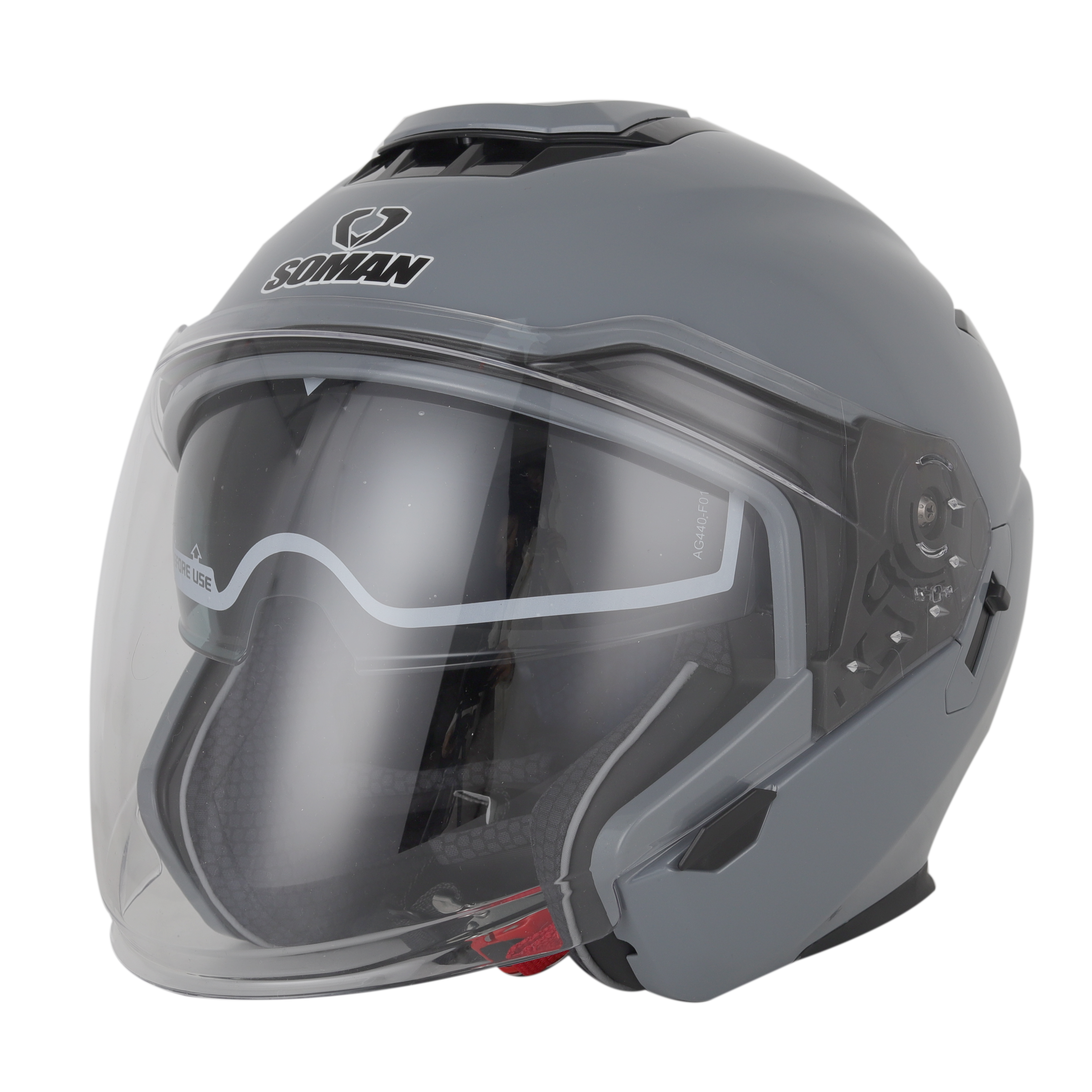 مدل Soman 527 GREY با طراحی مینیمال و رنگ خاکستری مات، جلوهای مدرن و حرفهای دارد که به خوبی با انواع موتورهای اسکوتر، شهری و تورینگ هماهنگ میشود. طراحی فک متحرک (Flip-up) این کلاه، به موتورسوار این امکان را میدهد که در مواقع نیاز، قسمت جلویی را بالا بزند و مانند یک کلاه نیمهفول (Jet Helmet) از آن استفاده کند. این ویژگی مخصوصاً برای رانندگان شهری که نیاز به مکالمه سریع یا استراحت در ترافیک دارند، بسیار کاربردی است.