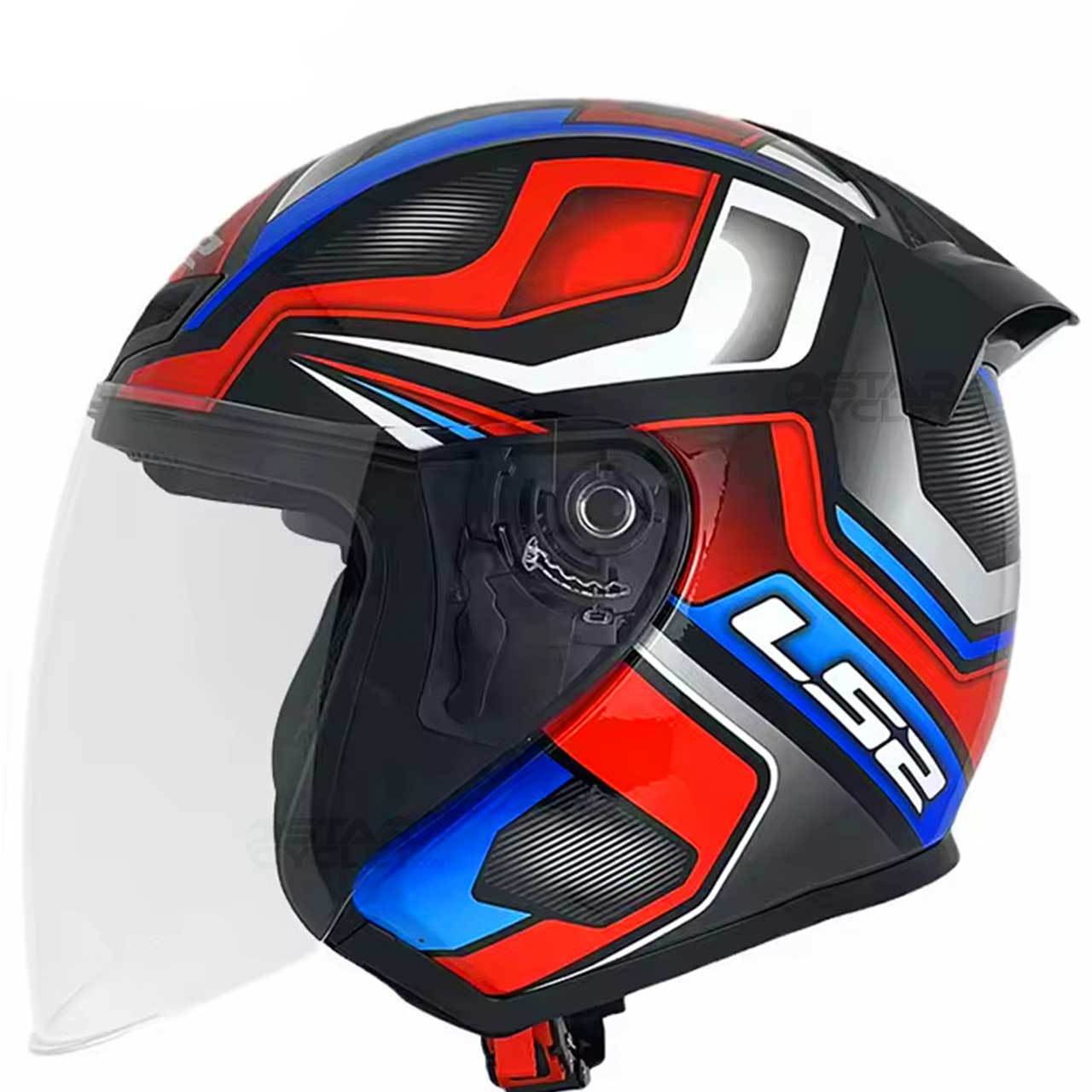 این کلاه با طراحی مدرن و اسپرت، ترکیب رنگهای قرمز، آبی، مشکی و نقرهای را ارائه میدهد که ظاهری جسورانه و حرفهای به آن بخشیده است. فرم نیمهفک و نقاب کوچک جلویی آن، باعث کاهش مقاومت هوا و بهبود عملکرد در مسیرهای شهری شده است. این مدل برای موتورسوارانی که به دنبال راحتی، ایمنی و تهویه مناسب هستند، یک انتخاب عالی محسوب میشود.