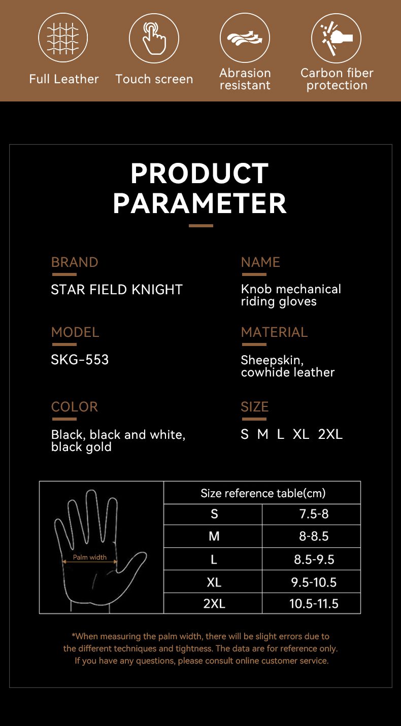 | سایر مشخصات | دارای ضربه گیر برای محافظت از دست;تعبیه ورودی هوا برای جلوگیری از تعریق دست;طراحی جذاب و زیبا;دارای یک لایه اضافه بر روی نقاط پراستفاده دستکش برای افزایش طول عمر;دارای تاچ گوشی |