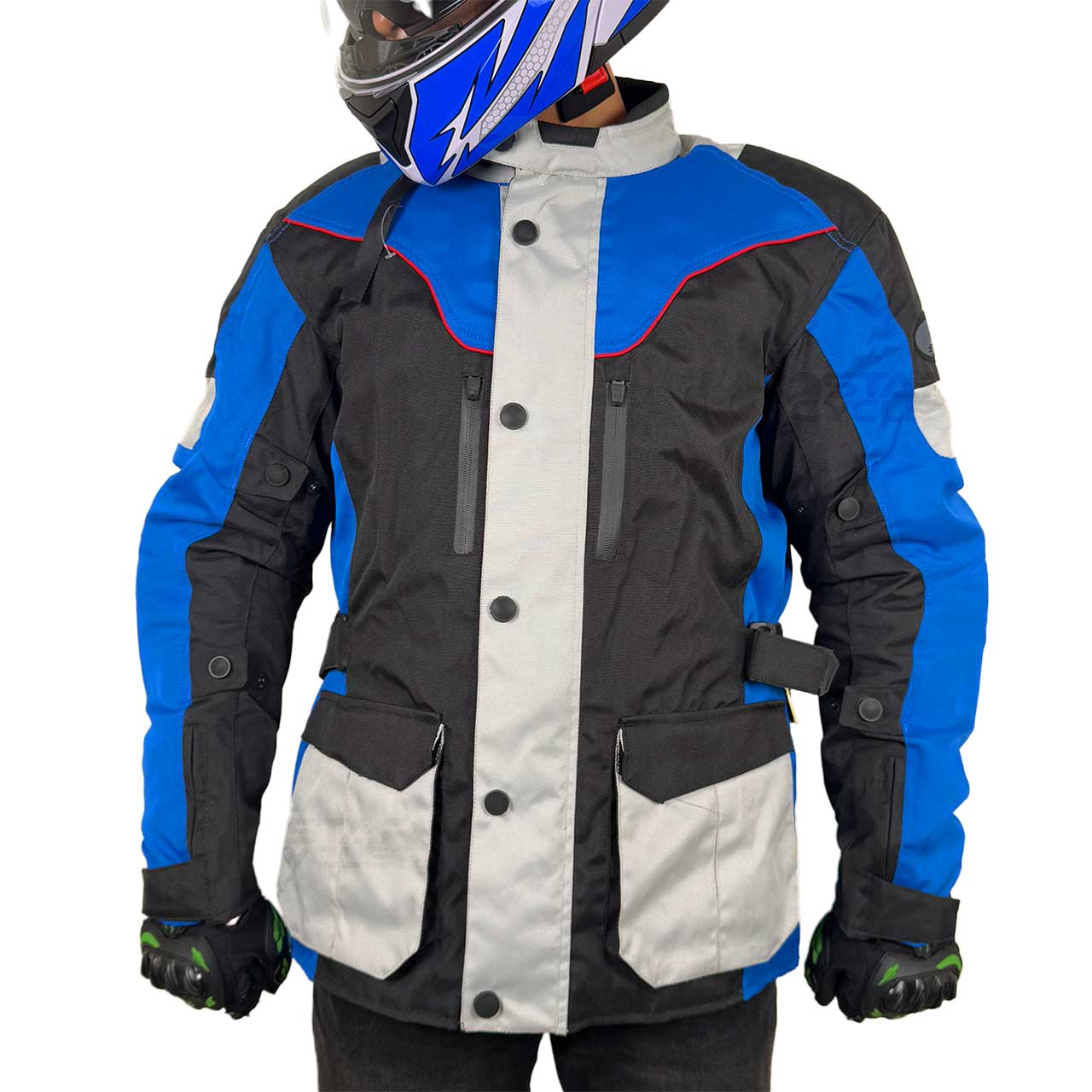 این کاپشن با ترکیب رنگی جذاب آبی، مشکی و نقرهای، ظاهری مدرن و اسپرت دارد که برای موتورسوارانی که به استایل اهمیت میدهند، ایدهآل است. طراحی آن به گونهای است که تمامی بخشهای بالاتنه، شانهها و آرنجها را به خوبی پوشش میدهد و از این نواحی در برابر ضربه و آسیب محافظت میکند.